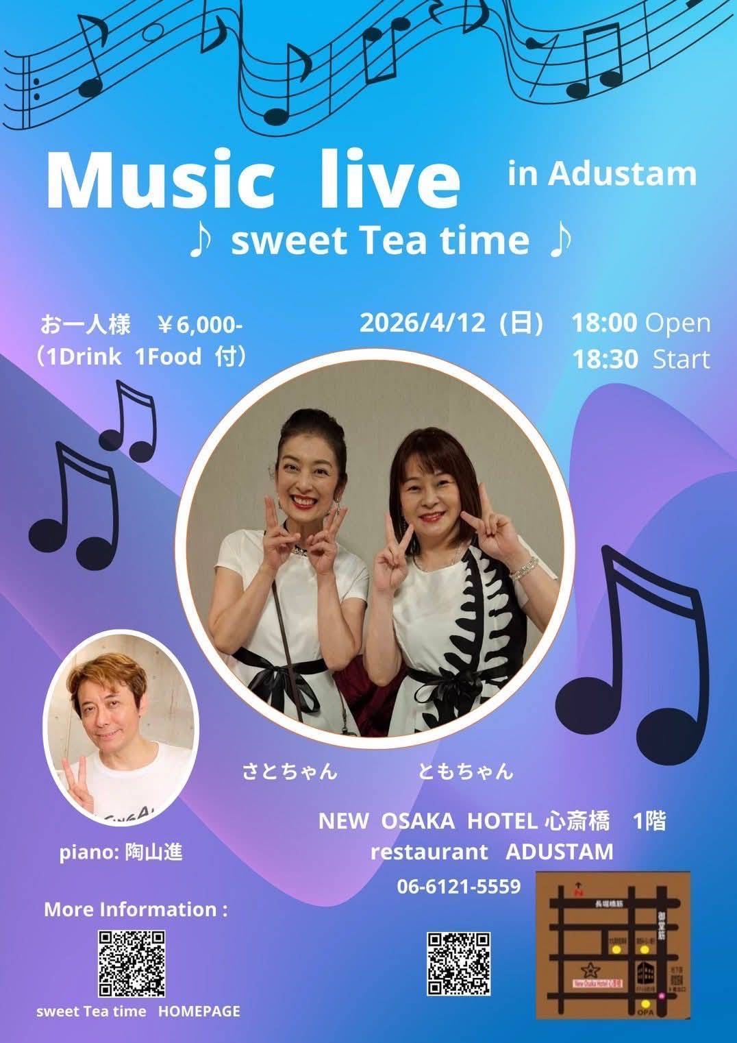 2026.02.20 LIVE LIVE情報 2026/4/12(SUN)18:00~ LIVE開催します! 【 出演 】さとちゃん、ともちゃん、陶山すすむ(PIANO) 【開催場所】 カフェバーアダスタム (ニューオーサカホテル心斎橋 1階) 【 時間 】 開場 18:00 開始 18:30 【 料金 】 1DRINK 1FOOD 6000円